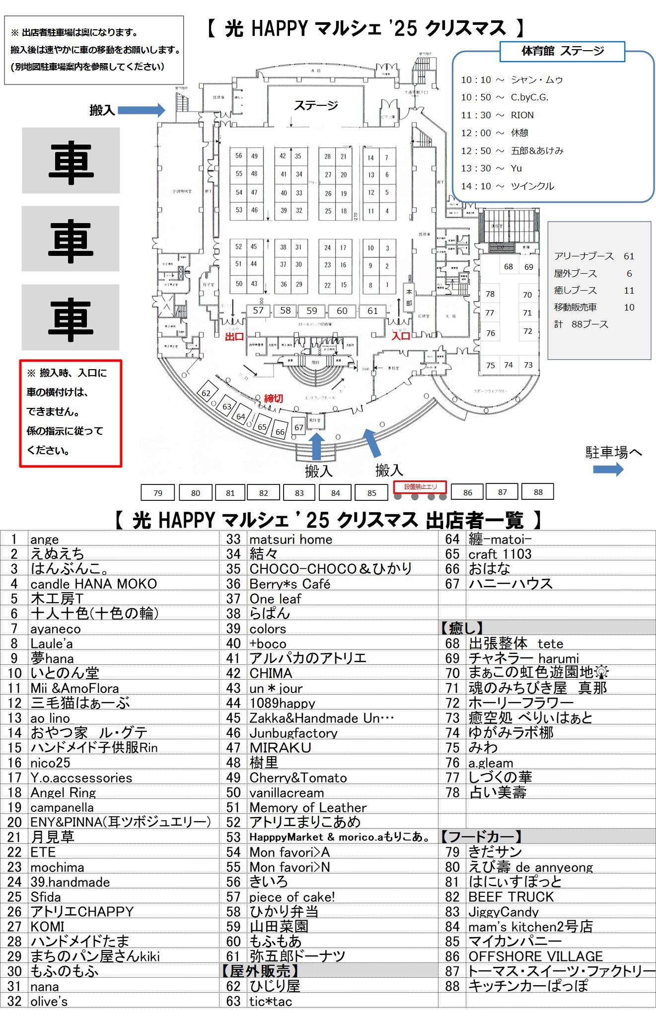 | 2025.12.13 | 各出店者様にお願い事としていました「光HAPPYマルシェ クリスマス くじ引き企画 出品のお願い」(中段に掲載)を今一度ご確認頂きますようお願い申し上げます。 |